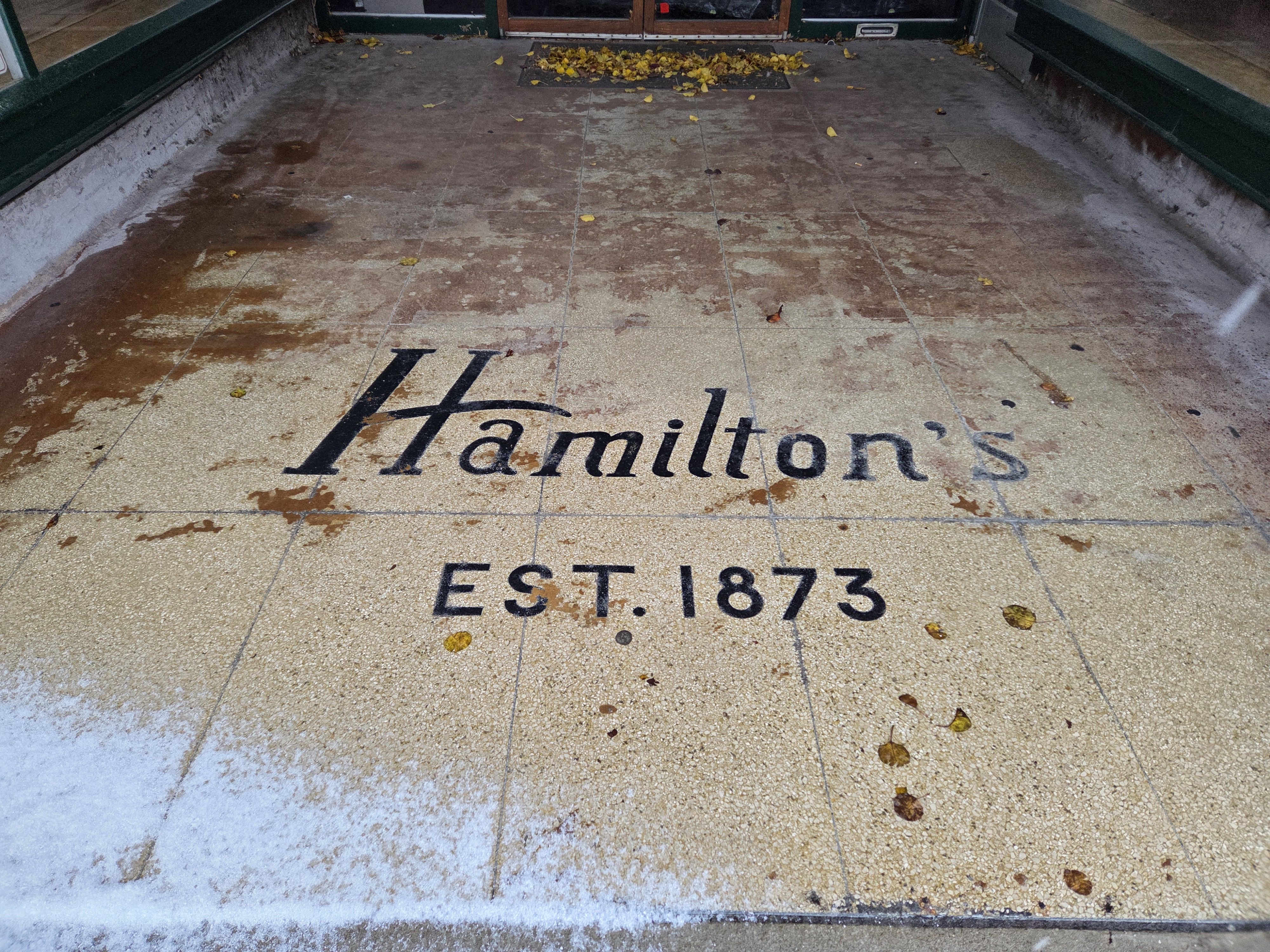 If you were to look down as you passed the now shuttered hobby store, you would see the name "Hamilton's" set into the ground: